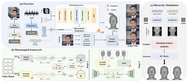 Architecture of MirrorTalkSynthesizing personalized talking faces that uphold and highlight a speaker’s unique style while maintaining lip-sync accuracy remains a significant challenge. A primary limitation of existing approaches is the intrinsic confounding of speaker-specific talking style and semantic content within facial motions, which prevents the faithful transfer of a speaker’s unique persona to arbitrary speech. In this paper, we propose MirrorTalk, a generative framework based on a conditional diffusion model, combined with a Semantically-Disentangled Style Encoder (SDSE) that can distill pure style representations from a brief reference video. To effectively utilize this representation, we further introduce a hierarchical modulation strategy within the diffusion process. This mechanism guides the synthesis by dynamically balancing the contributions of audio and style features across distinct facial regions, ensuring both precise lip-sync accuracy and expressive full-face dynamics. Extensive experiments demonstrate that MirrorTalk achieves significant improvements over state-of-the-art methods in terms of lip-sync accuracy and personalization preservation.